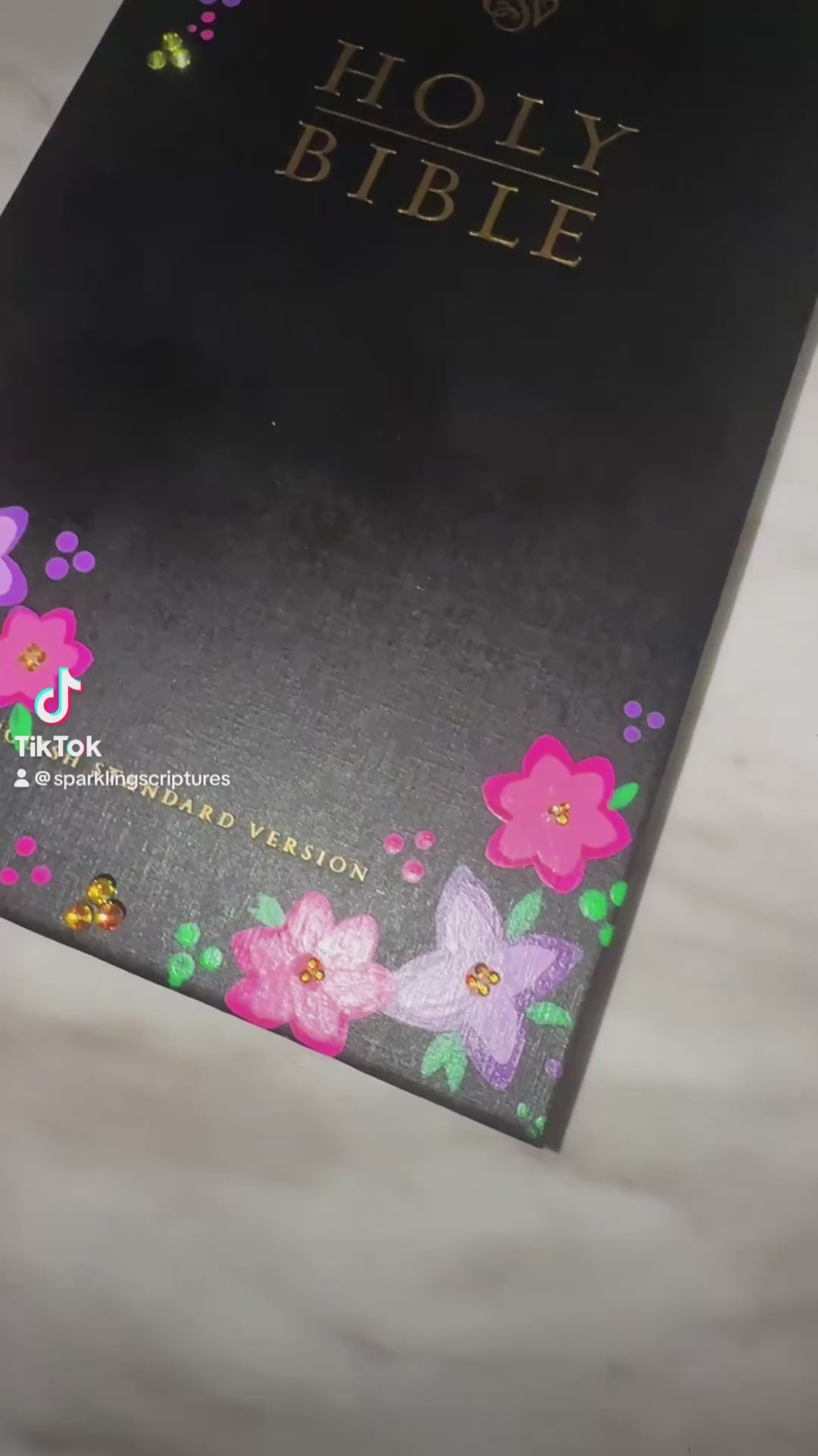 Discover a hand painted Bible adorned with pink and purple flowers, gold rhinestones adding a touch of sparkle. Perfect for those seeking a touch of whimsy and beauty in their Bible study.